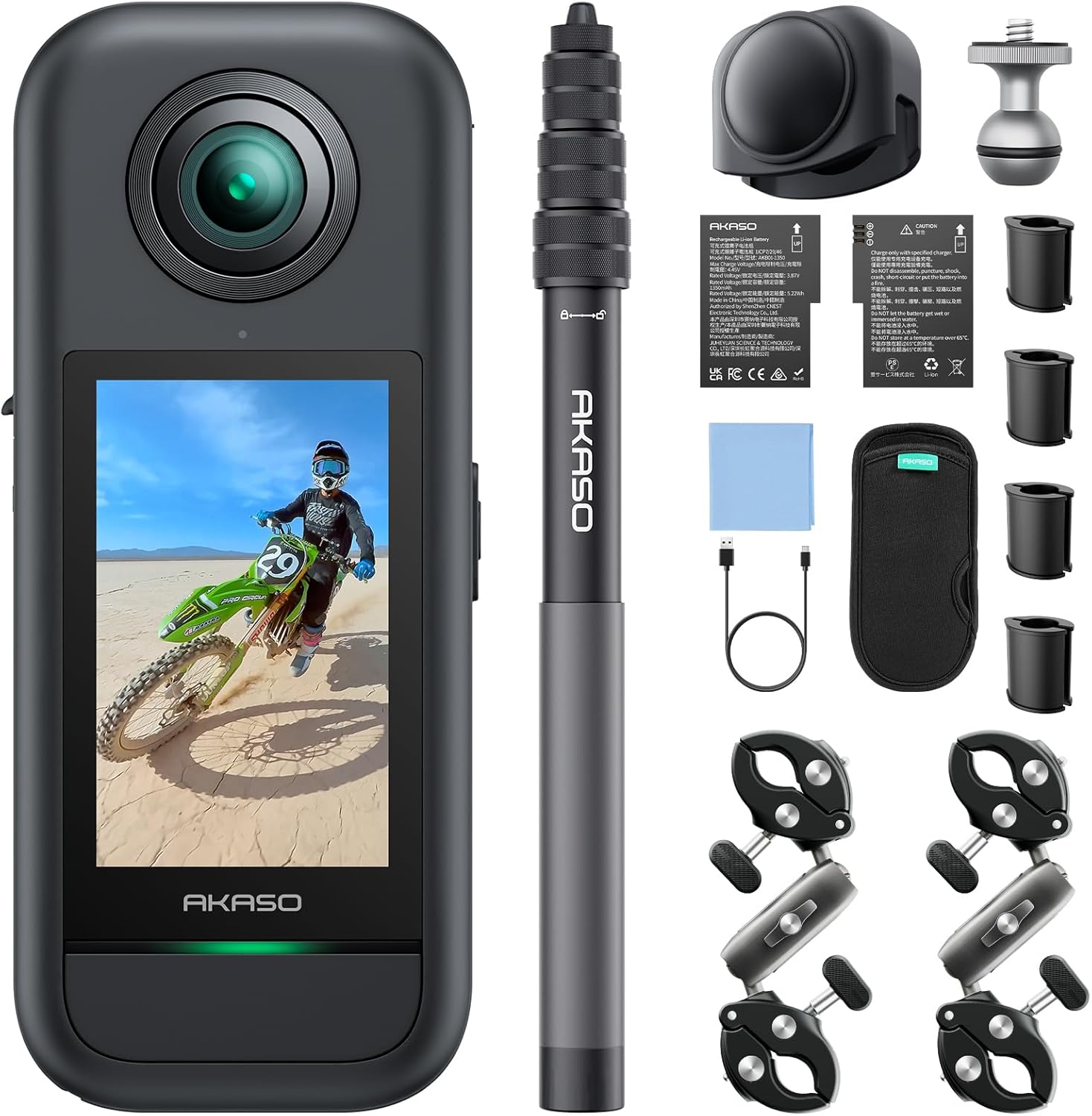 AKASO 360 Kit Moto Caméra Sport 360° 5,7K 72MP SuperSmooth Écran 2,29" Selfie Stick Invisible Horizon 360° Lock Carte 128GB